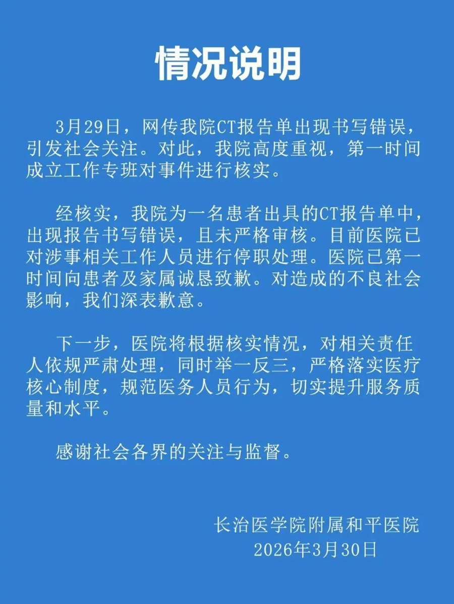 今天(3月30日),山西长治医学院附庸和平病院发布情况阐述: