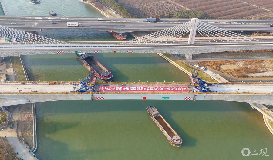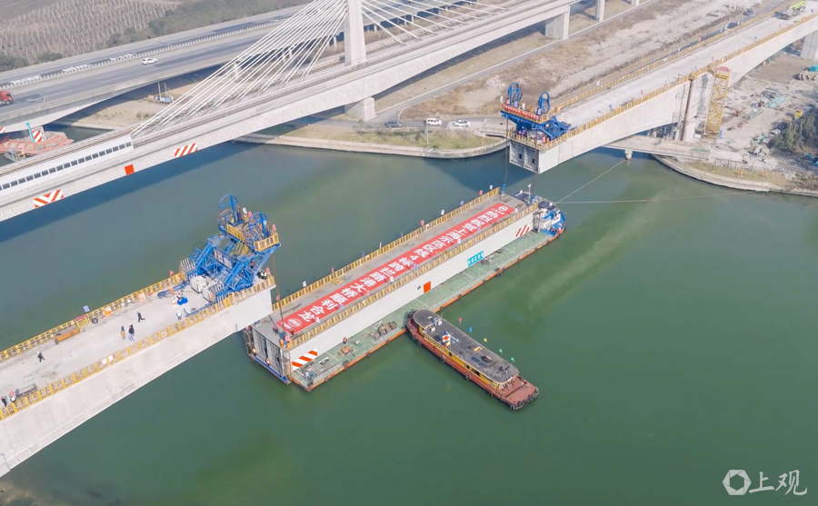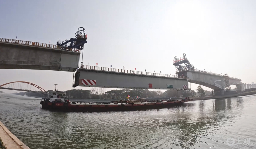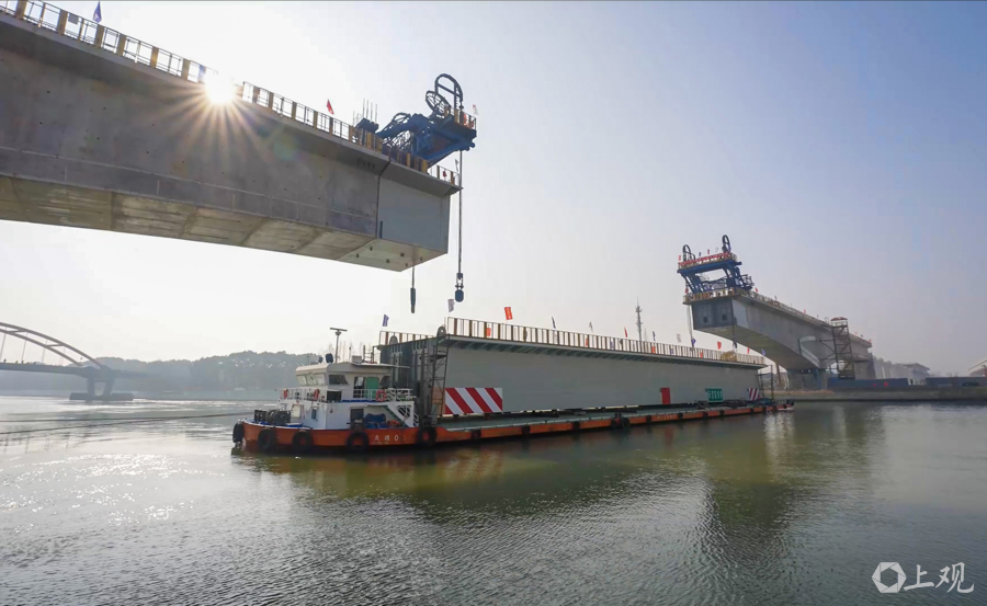 1月22日上午,钢箱梁吊装现场。