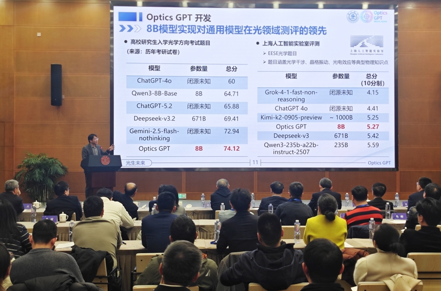 上海交通大学教授义理林介绍,作为完全自研的国产模型,光学大模型具备轻部署、 高认知、强应用、全可控的特点。模型规模为 8B 参数量级,支持端侧与边缘高效部署,显著降低光学行业应用门槛;通过系统化、结构化注入光学领域知识,形成深厚的“光学素养”和精准的物理直觉;在算法生成、系统诊断、仿真设计、实验辅助等核心场景中性能全面领先;从数据构建、模型训练到部署运行全流程自主可控,保障产业安全与数据隐私。