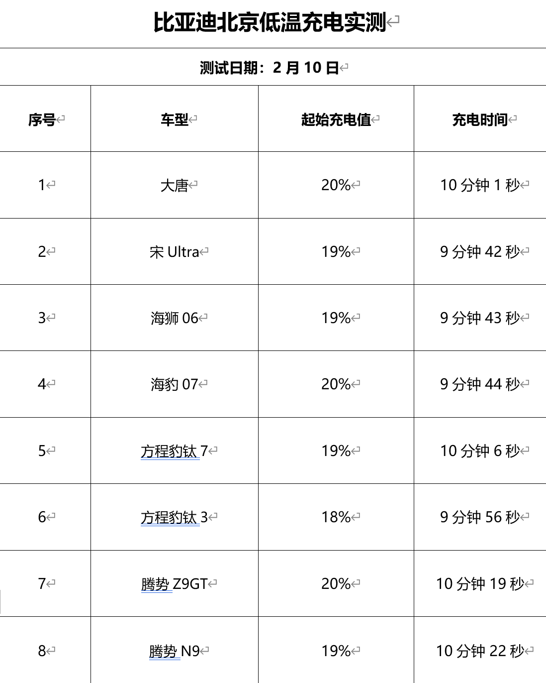 以下是8辆测试车型的具体充电时长统计