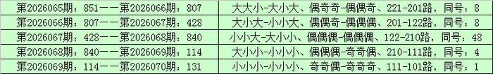 统计罗列三已开出的奖号发现,在聚拢5期(第2026065期-第2026069)奖号为:851-807-428-840-114。