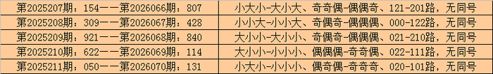 在罗列三历史开奖中,第2025207期-第2025211期聚拢5期奖号为:154-309-921-622-050。