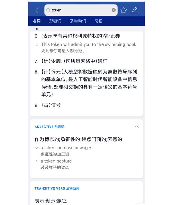 大开新推出的《英汉大辞书》APP,token一词释义已更新加入“词元”这一释义。该释义是宇宙科学本领名词遒劲委员会(宇宙科技名词委)在近期刚刚阐述的范例化汉文命名。