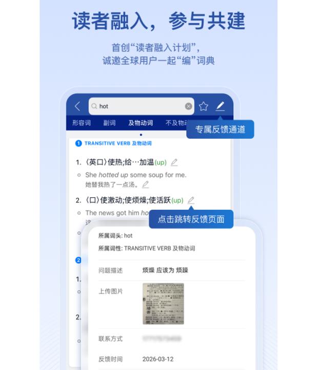APP上线后,会员均可参与“读者融入筹备”,在相应功能页面为辞书编纂孝敬最新语料。这一在线功能将冲破“读者融入筹备”原先只可依托“读者群”进行的局限,作念到每个东谈主遍地随时能对编纂产生孝敬。编纂处将对读者孝敬的语汇及例证进行进一步校准和聘任。