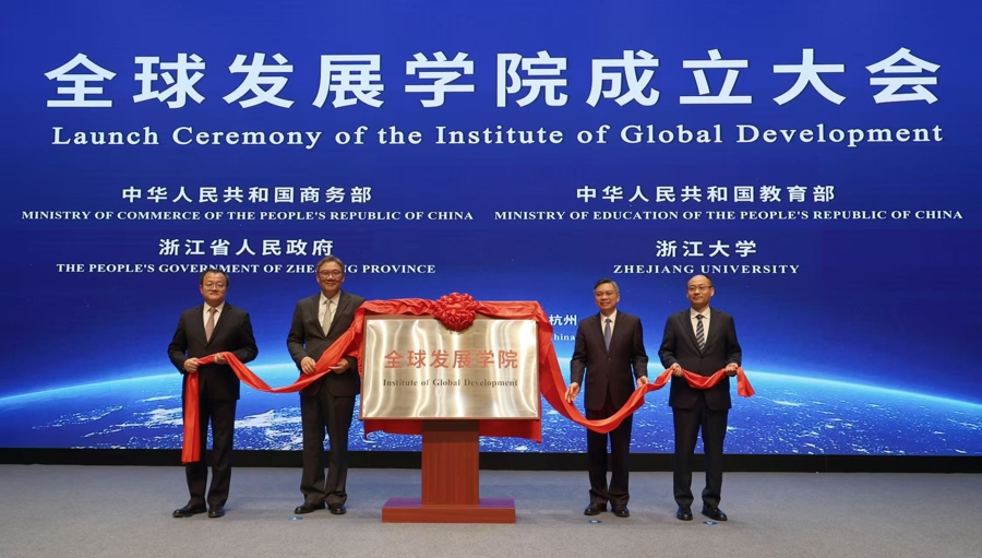 成立大会上广州配资公司,商务部部长王文涛、浙江省省长刘捷、解释部副部长杜江峰、浙江大学校长马琰铭为全球发展学院揭牌。